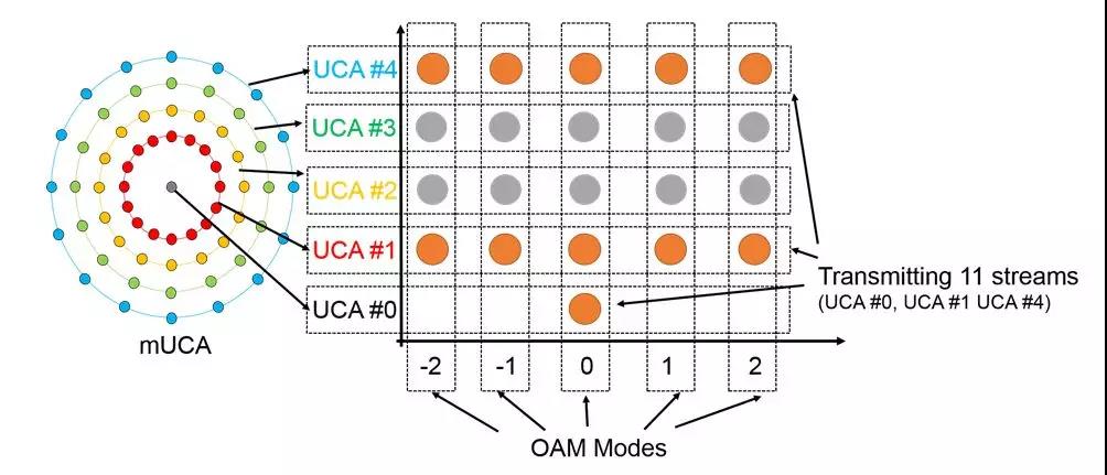 天线由四个同心均匀圆形阵列(UCA #1-4)和一个位于中心的单天线阵元(UCA#0)组成。UCA #0-4生成-2、-1、0、1、2五种不同OAM模式正交复用,并通过MIMO技术对相同模式内的复用信号分离,最终实现可多达21路复用数据信号同时传输,大幅提升传输速率。