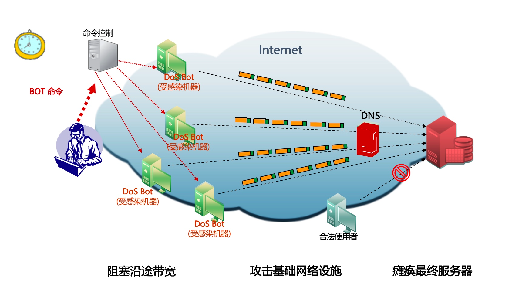 拒绝服务(DoS):DoS是 Denial of service的简称,即拒绝服务,任何对服务的干涉,使得其可用性降低或者失去可用性均称为拒绝服务。例如一个计算机系统崩溃或其带宽耗尽或其硬盘被填满,导致其不能提供正常的服务,就构成拒绝服务。