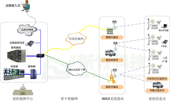 iCMVS-3010可拆卸式监控系统应用主要是与固定式、车载式iMAX无线城域网基站BS配合,实现快速部署的。典型应用拓扑示意图如下: