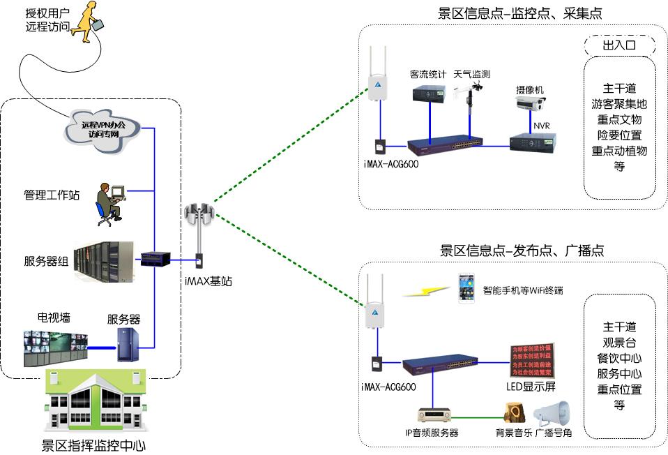 针对景区的wifi系统及信息节点联网的综合需求,新竹科技最新推出的iMAX无线城域网与wifi双模无线网关系统iMAX-ACG600非常适合景区边缘信息点的接入使用。