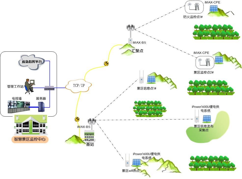新竹科技将联网与供电集成设计的思路,使行业客户可以克服景区内湖泊、道路与树林等的阻隔而迈入“互联网+”时代,作为“新基建”中物联网、5G和智能化等系统的基础设施,无线城域网与锂电太阳能堪称完美搭档。综合系统拓扑示意图如下: