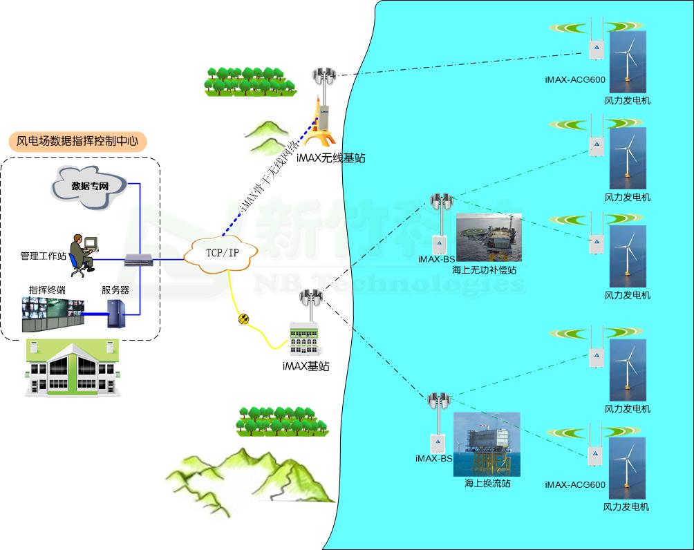 iMAX无线城域网系统很适合超远距离大规模的无线专网组建,在风电场联网管理控制专网建设方面,iMAX-6000、iMAX-8000各系列产品都有很好的应用前景。其风电行业应用主要技术优势: