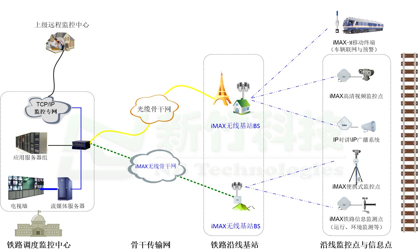 定位于物联网行业无线、视频与智控专家的新竹科技,为铁路沿线的监控推荐最理想的解决方案。iMAX无线城域网系统解决离散信息点与骨干网连接回程的问题,锂电太阳能供电系统解决离散监控点或信息点供电的问题,前端特种激光夜视一体化系统解决昼夜监控看得远、看得清的问题,三者相辅相成,共同为用户打造了一个完美的离散信息点解决方案。