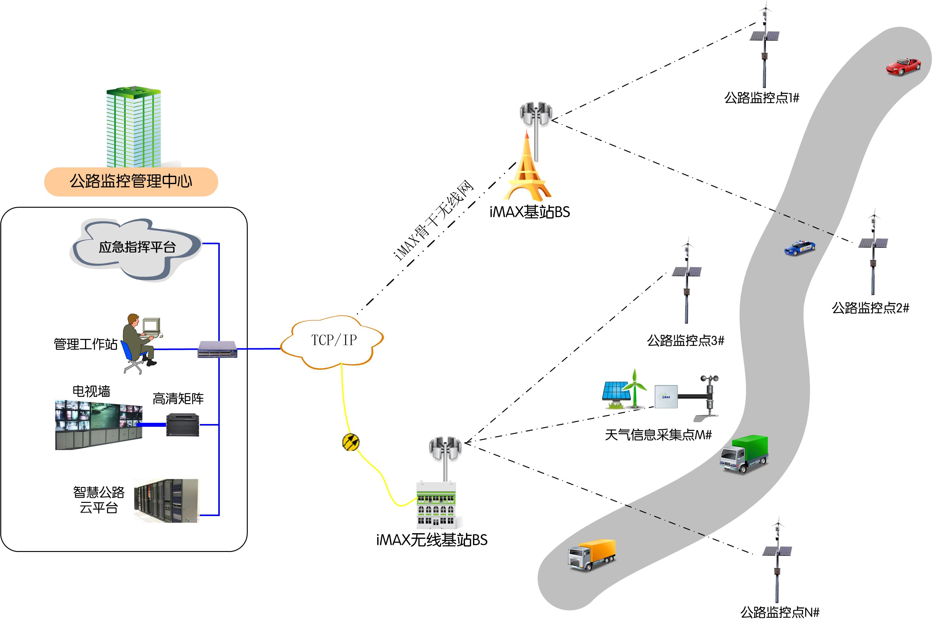 在智慧公路升级建设和管理中,使用最广泛是道路视频监控(路况监控、电子警察、电子卡口等)。在这类道路视频监控使用中,首先,传输链路需要满足高清视频稳定传输的需要,保证视频的流畅度和稳定性,采用802.11系列WiFi协议的板卡改造的中低端无线设备,很难满足长距离、实时、高清视频稳定传输对链路稳定性的苛刻需要,图像易出现抖动、拖尾、卡顿、马赛克等问题,更有甚者,图像根本不能使用。第二,公路沿线安防监控,工作环境恶劣,且位置偏僻,不易维护。如果采用品质不高的中低端无线产品,因为高低温、雷电、风雨、腐蚀等环境原因出现质量问题,导致系统不可以用,那对使用者和管理者会是大麻烦。所以,智慧公路沿线的采用高带宽、高容量、高品质的iMAX无线城域网系统是必然。智慧公路使用iMAX无线城域网系统组网示意图如下: