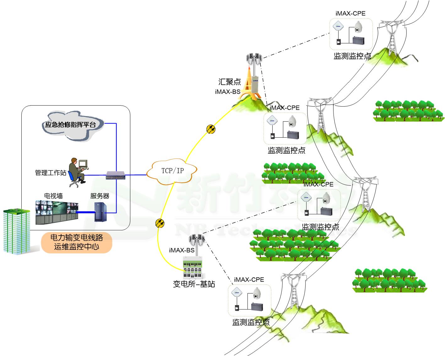 需要强调指出的是,iMAX无线通信系统具备高带宽和多业务混合组网能力,全面采用TCP/IP协议标准,非常适合传输电力在线监测系统与视频监控管理视频、语音、网络、数据多种媒体的“多网融合”,并可根据电力用户的需要设置业务优先级,保证了多系统的使用效果。