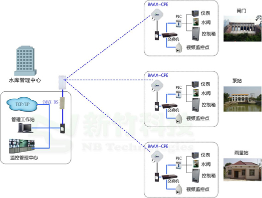 如果采用新竹科技提供的室外超远距离通信专用的iMAX 5G系统解决联网,通常来说,一个中小型水库做环湖的监测监控,只需要在区域内制高点建设少量基站BS就可以实现无线接入覆盖,分散在水库周边的监测监控点上只要架设了高带宽无线CPE,就可以实现图像、数据的汇聚和控制信号的传输,是真正意义的“多网合一”系统。典型应用拓扑示意图如下: