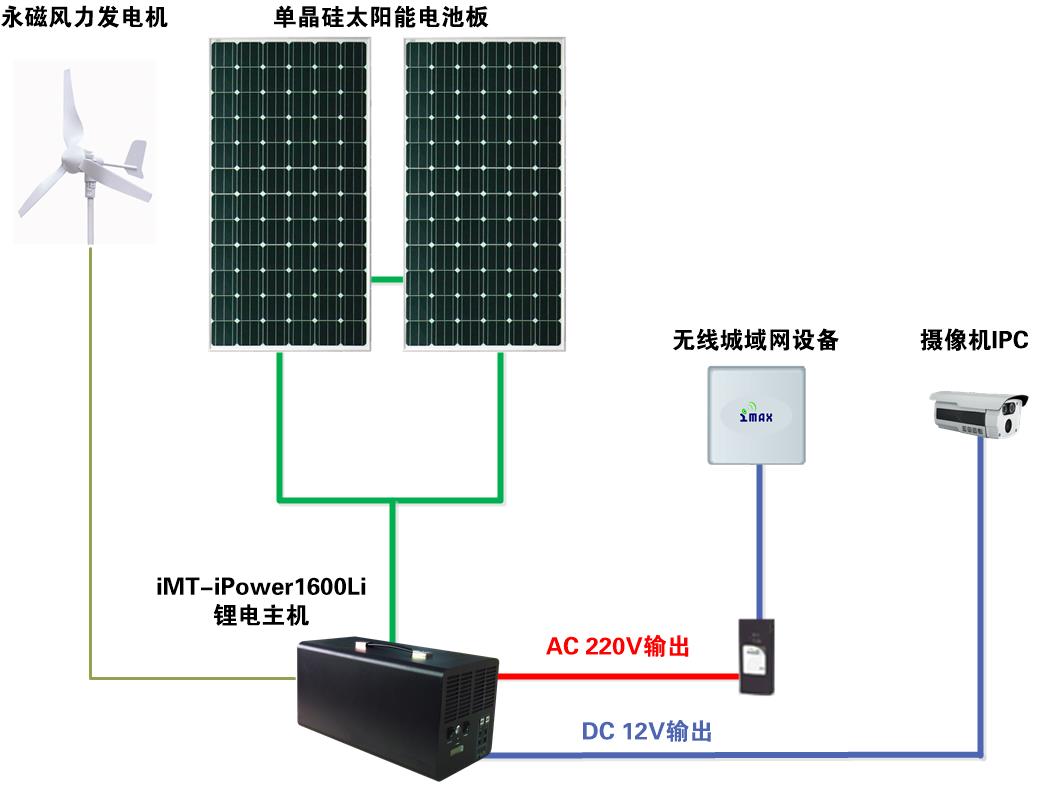 iMT-iPower1600Li是集成化的新能源离网独立供电系统,主要是解决物联网行业(特别是安防行业)无线网络系统、视频监控点、信息监测点等电子设备离散及野外环境使用时的供电问题。该系列产品解决了在水库、河道、湖泊周围分散的监控点与信息监测采集点的长期供电问题。该系统基于锂离子电池为核心主机、高性能单晶硅太阳能电池板与永磁风力发电机,与普通的风光互补供电系统比较,具备结构简单、体积较小、重量较轻、反复充放电次数多等优点,创新性的交直流双输出模式非常适合IT系统在野外环境应用。
