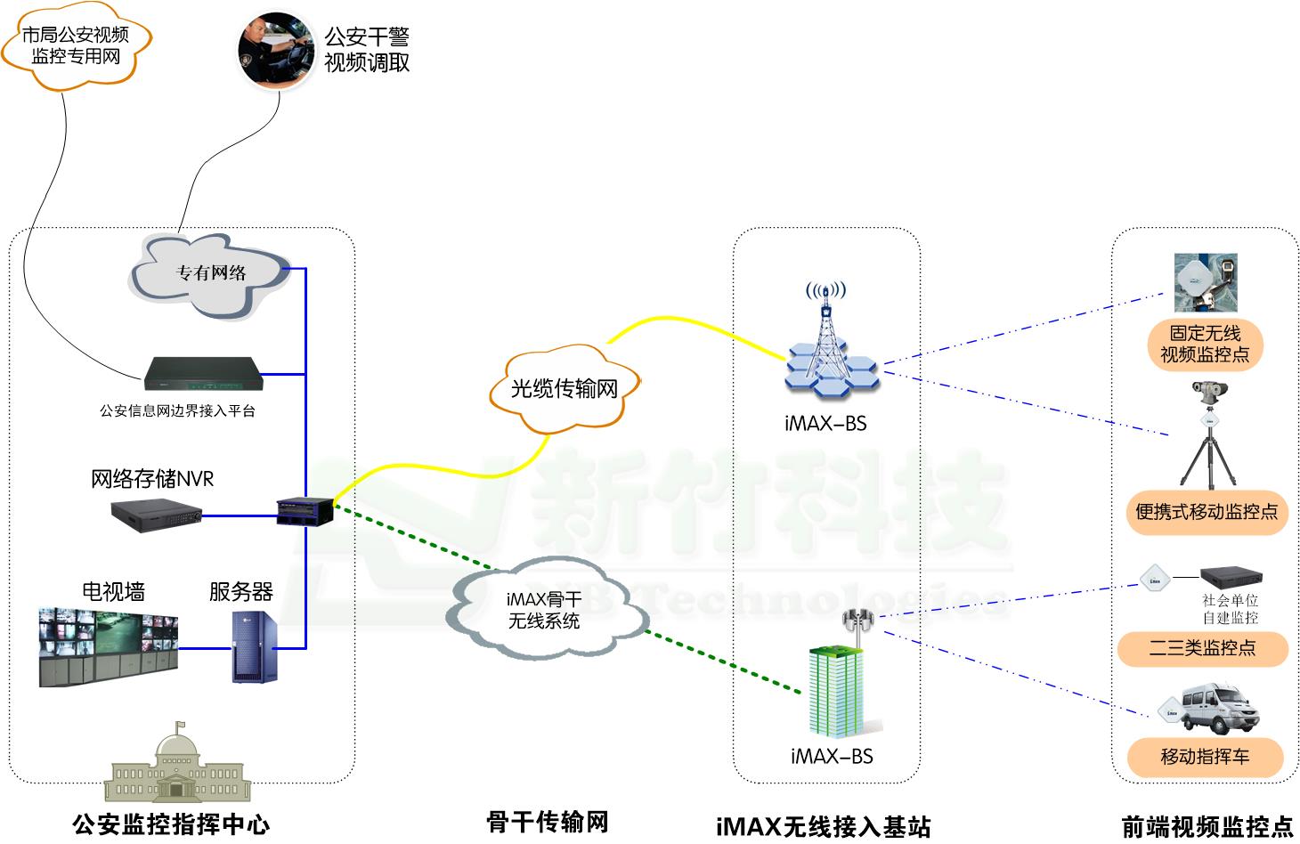 新竹多年的安防从业经验总结,山区、丘陵、湖泊边缘、道路沿线等场所,往往地形条件复杂。只有使用无线手段来解决边防监控点的联网问题。但是,动辄几公里的通讯距离,普通的WiFi无线系统或低端无线网络系统是无法满足此种需求的。再者,如果系统设备的环境适应性(防雷、防雨、高低温、抗腐蚀等)不好,可靠性不高,品质不满足使用要求,系统可能会经常出故障,对于公安用户和系统集成商来说,这种条件下的维护成本投入会非常高,目前业内只有极少数针对中高端市场的、电信级或军工级的无线系统,例如iMAX无线城域网系统,才有如此高的品质和可靠性保证。新竹科技采用iMAX无线网络系统,定制的公安平安城市无线视频监控解决方案是目前行业内最为切实可行的、性价比最高的高清视频传输城域专网解决方案。