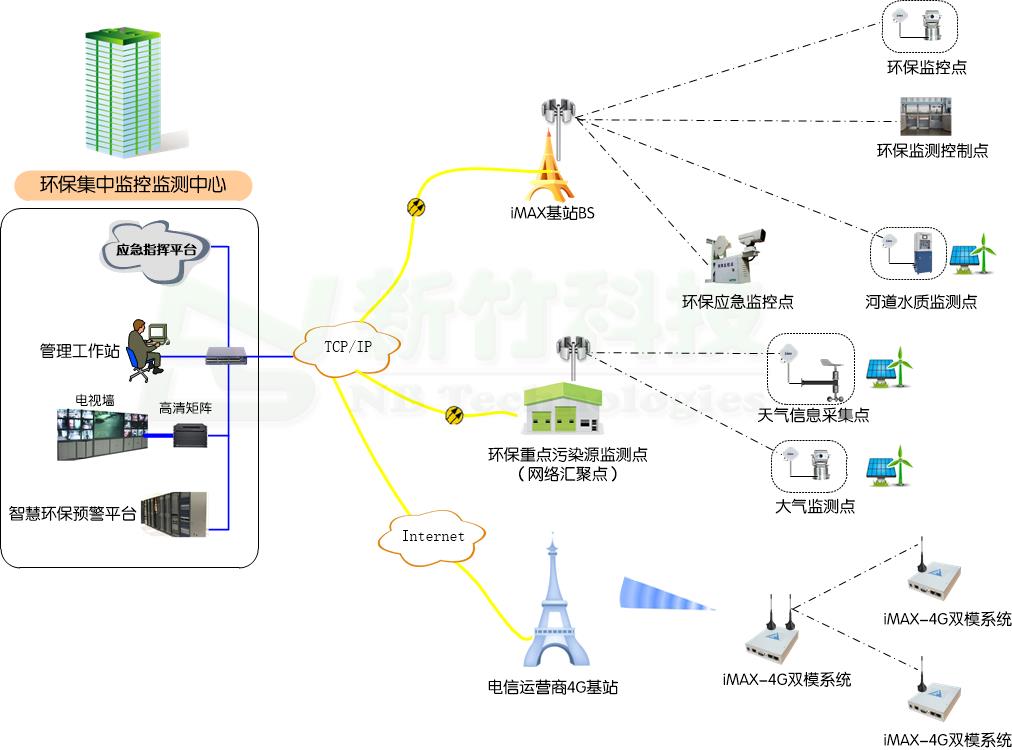 根据新竹科技对环保行业实际应用的调研分析,环保信息点联网比较适合用“租用光缆专线+iMAX无线网络系统+4G运营商网络”这种混合模式来解决。这种应用方式,新竹科技iMAX-4GW300系列4G城域网双模无线系统非常合适。