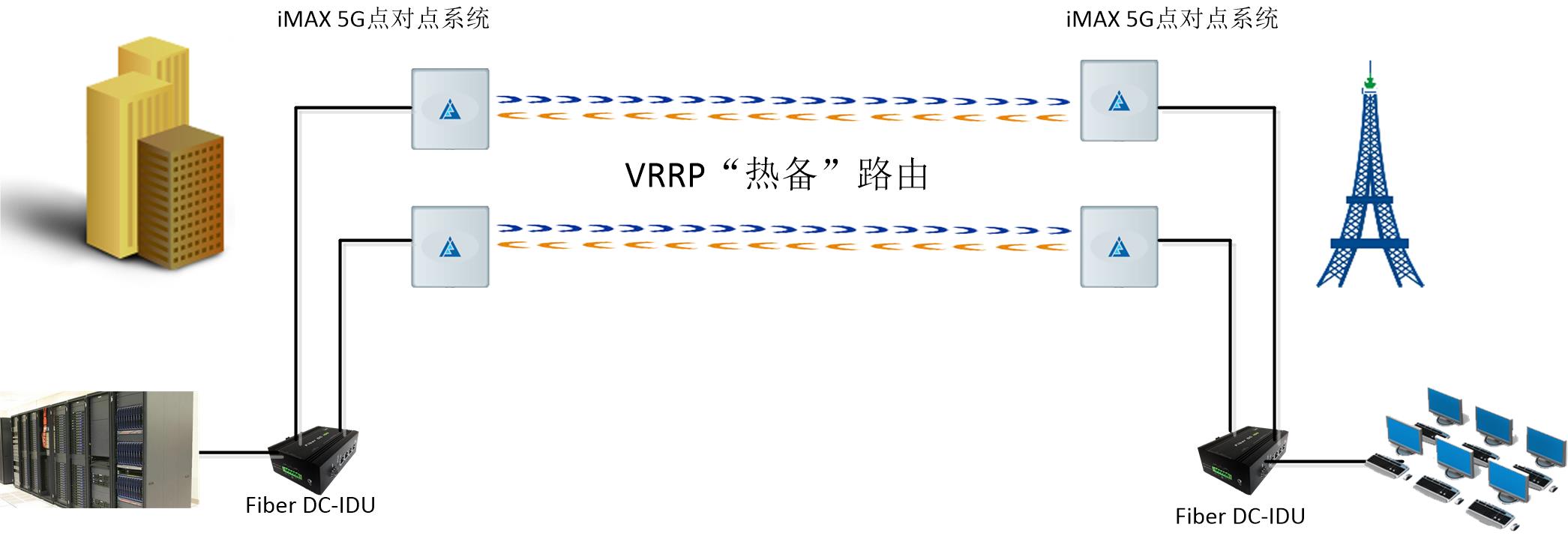 图中示意的是两跳无线链路互为热备的组网结构,具体应用时完全可以多跳无线链路做热备冗余,可靠性会进一步提高。采用VRRP技术做虚拟热备冗余路由的两跳或多跳无线链路,其可靠性相较单跳无线链路明显大幅提高。