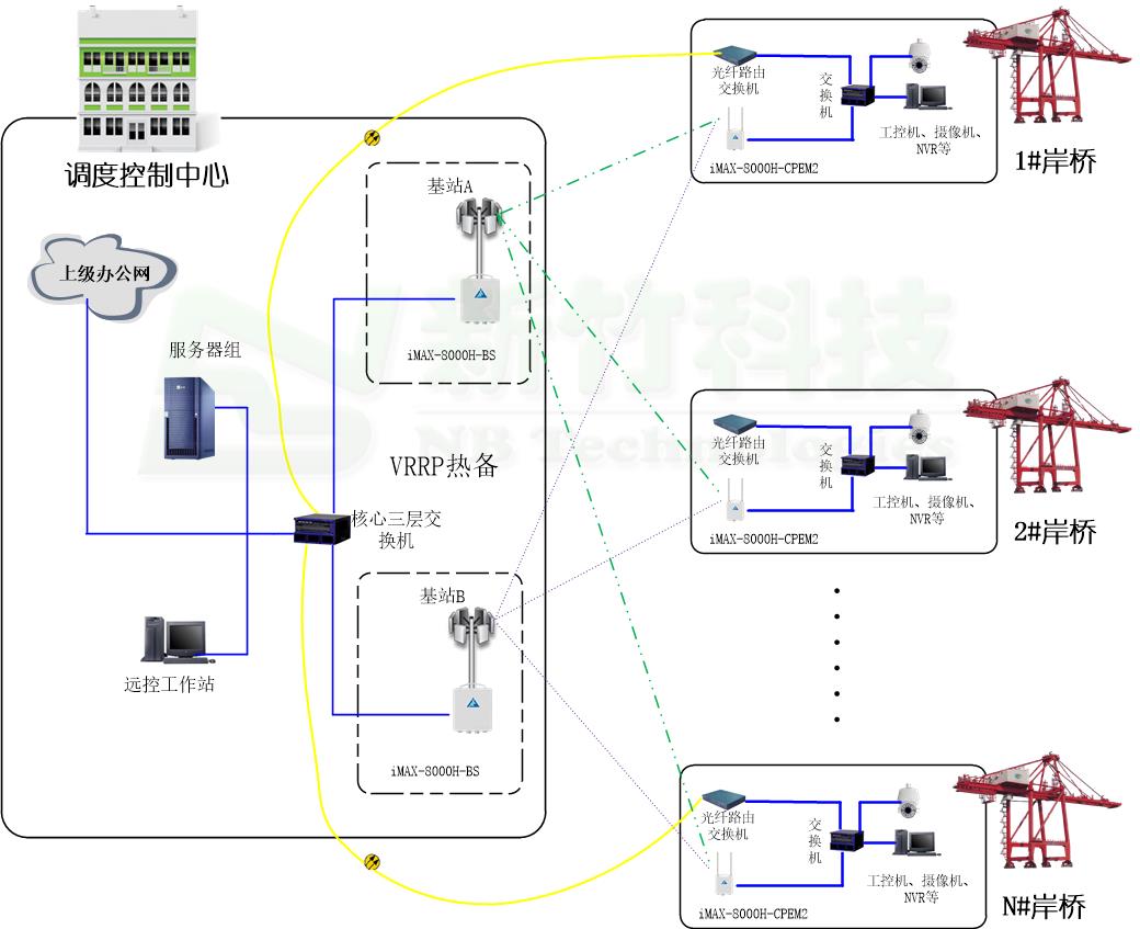 典型岸桥光网络与iMAX无线专网热备组网(无线本身也采用热备结构)拓扑示意图如下: