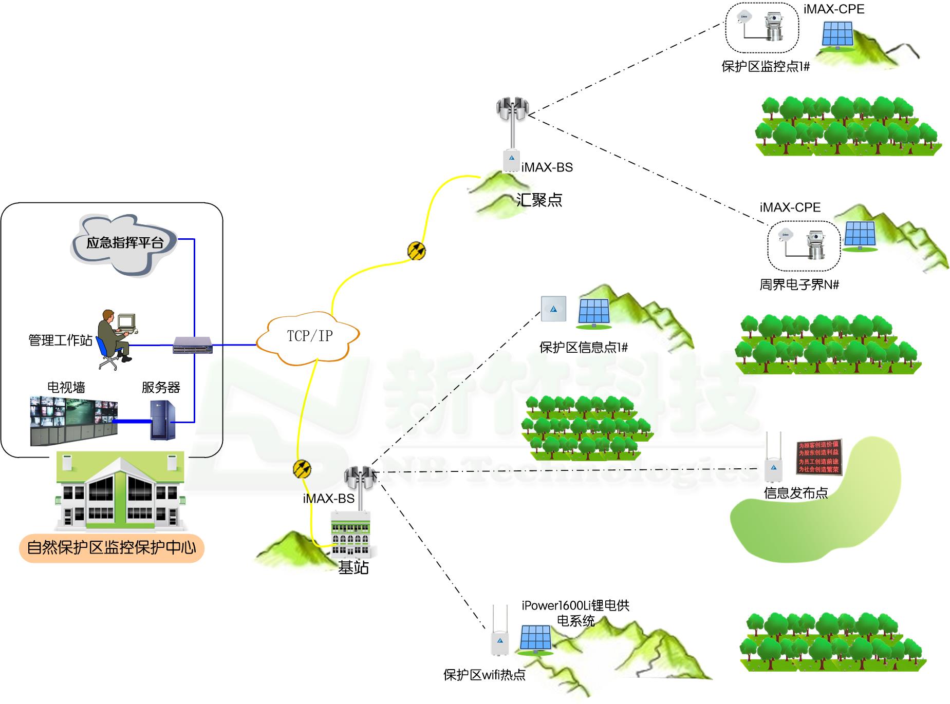 习近平总书记指出:“生物多样性关系人类福祉,是人类赖以生存和发展的重要基础。”人类的生存和发展,离不开健康的生态系统,生态兴则文明兴。要加快建立以国家公园为主体的自然保护地体系,有效保护野生动物栖息地、迁徙通道;不断完善相关法律法规,严格监管,严厉打击滥捕滥猎违法犯罪行为,斩断非法利益链。 国家公园或自然保护区大都地处偏远的山地、林地、荒漠、河流或者湿地等地方,这些地区的保护不但对于保持生物的多样性起着至关重要的作用,在气候调节、生态屏障、旅游开发与发展经济等诸多方面也有着重要的意义。当下,如何利用现代化的科技做好林地、湿地、山地等自然保护区的保护工作,成为保护珍稀野生动植物和生态环境的首要问题。 经调查,全国各地的国家公园和自然保护区大都大大小小建设了部分监控、监测系统,但因投资有限且建设难度太高,都难以形成规模,完全不能满足全面监控和防护的需要。分析其原因,主要有如下几点难题使得野生珍稀动植物保护网络化监控系统建设难以实现: 1、地域广:山地、林地等自然保护区的特点,越是人迹罕至的地方,越需要监控或收集生态信息,信息点位分散,相邻信息点之间间隔几十公里很正常,用常规方式建设监控保护系统,建设成本过高,并且极易遭到破坏,甚至根本无法实现。 2、系统多:各类信息收集,需要不同的系统配合(双光谱视频监控、野保相机、周界电子桩等),但是针对数据传输方面,难以统一,需要重复建设多种链路解决传输,经济性大打折扣。 3、维护难:在地广人稀的保护区内,信息点位分布又分散,如果不采用品质过硬的设备,仅后期维护跑现场都是一笔非常大的开支,不仅浪费大量人工和时间,系统的使用效果还大打折扣。 具体来说,自然保护区内部署监控、监测系统,最主要难点就是终端信息点的联网,还有设备野外环境长期使用的供电问题。随着太阳能及风力发电系统的成熟和普及,供电问题在很多地方都可以解决了,但如何联网一直是此类系统难以落地的最大难题。有没有高性价比解决方案能解决自然保护区的联网问题呢? 采用城市内常用的光缆为主的组网方式,在自然保护区是完全行不通的,主要原因是: 无论埋管安装或者立杆架设光缆,都需要与沿途的村庄和农户协调,埋管铺设需要建设竖井用于维护,立杆则更是需要与途径地块农户协商才能完成。而今村庄和农户的协调越来越困难,除了越来越高昂的一次性建设费用以外,有些农户还会提出每年支付“租金”,不付清费用甚至会有极端情况出现,破坏光缆。 立杆架设光缆相对埋管安装成本稍低,但是由于架空明线很容易被过往车辆剐断,造成系统断网事故;即使埋管在地下,也有可能因为村镇施工挖沟等造成光缆损坏,造成短时甚至长时间的断网。自然灾害(山洪、泥石流等)也会导致光缆的破坏,还有人为原因导致的光缆电缆断网,如遭到不法分子的盗窃割断。而且因为地处偏僻,一旦遭到破坏,其修复的难度更大、成本更高、耽误时间也更长。 光缆本身的材料成本其实并不高,但是挖沟埋管安装或者立杆架设的成本却因为人工成本、租用挖沟机吊车等方面成本的上升而逐年上升,动辄每公里几万元的建设成本,推高了系统整体造价。在山地、林地和湿地自然保护内铺设光缆,暂不论政策是否允许,其造价可能是城市建设成本的数倍,动辄几万元每公里的高昂的代价不是IT系统可承受的。 光缆挖沟埋管安装或者立杆架设施工的难度非常大,特别是在农村及偏僻的野外地区,动辄数月数年的施工时间,可能项目还未交付前面铺设的光缆就已经损坏。 综上所述,采用光缆这种方式其实是造价高、周期长,还不利于后期的使用和维护,造成整个系统可靠性和可用性下降。很显然,自然保护区与国家公园这种环境条件,无线通信系统的优势明显——施工周期短、部署容易、费用较低且更方便升级扩容与维护。 可能有人会担心无线系统的可靠性,其实,无线通信系统和光通信系统一样,都有优劣之分,都有高中低端配置,真正专业的无线通信系统同样可靠稳定,甚至比光缆链路更可靠!并且,使用无线技术无疑是成本最低、最快速而高效的解决方案,但使用哪种无线技术才是本项目最合适的方案呢? 使用现在热门的“无线公网技术—4G\5G”技术来组网,对于自然保护区来说是完全无法实现的。熟悉自然保护区环境的用户可能非常有体会,受制于接入局限(运营商基站覆盖效果)、带宽局限(运营商基站接入能力)、费用高企(流量包计费长期使用是无法承受的)、安全问题(公网接入)等,4G\5G是无法应用于这种项目的。 无线技术的另一分支——WiFi技术迅猛发展,使其成为理想的局域网延伸系统,但利用2.4G\5.8G WiFi系统作为组建城域网方案,它也有着先天的不足:通信距离太短、视频容量不足,根本无法满足自然保护区的组网需求。 新竹科技结合多年景区、公园、水利、石油等行业野外区域无线组网经验,总结了最适合自然保护区野生动植物保护使用的无线专网方案。方案的核心是iMAX 5G无线城域网专网的应用: iMAX无线城域网系统设计的目标就是解决室外环境超远距离网络互联的,各系列设备通信距离都很远。其中,作为野外通讯骨干网的有iMAX-6000,作为接入网的有iMAX-8000多个系列等。同时,还有室外特种WiFi双模网关iMAX-AGC600系统,可为信息