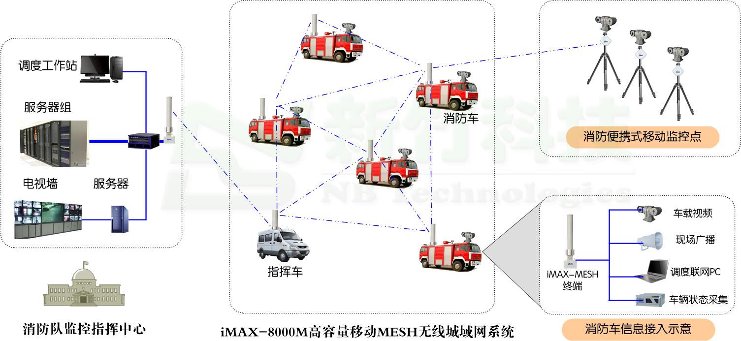 综上所述,以上这几种方式都有自己致命的缺点。消防车现场战术指挥调度是无线专用网络,需要专有的无线技术,以上几种技术显然不合适。新竹科技提供的iMAX-8000M 5G高容量移动MESH无线城域网系统,因其快捷、灵活、高带宽的应用特点,对于这种应用就非常合适了!